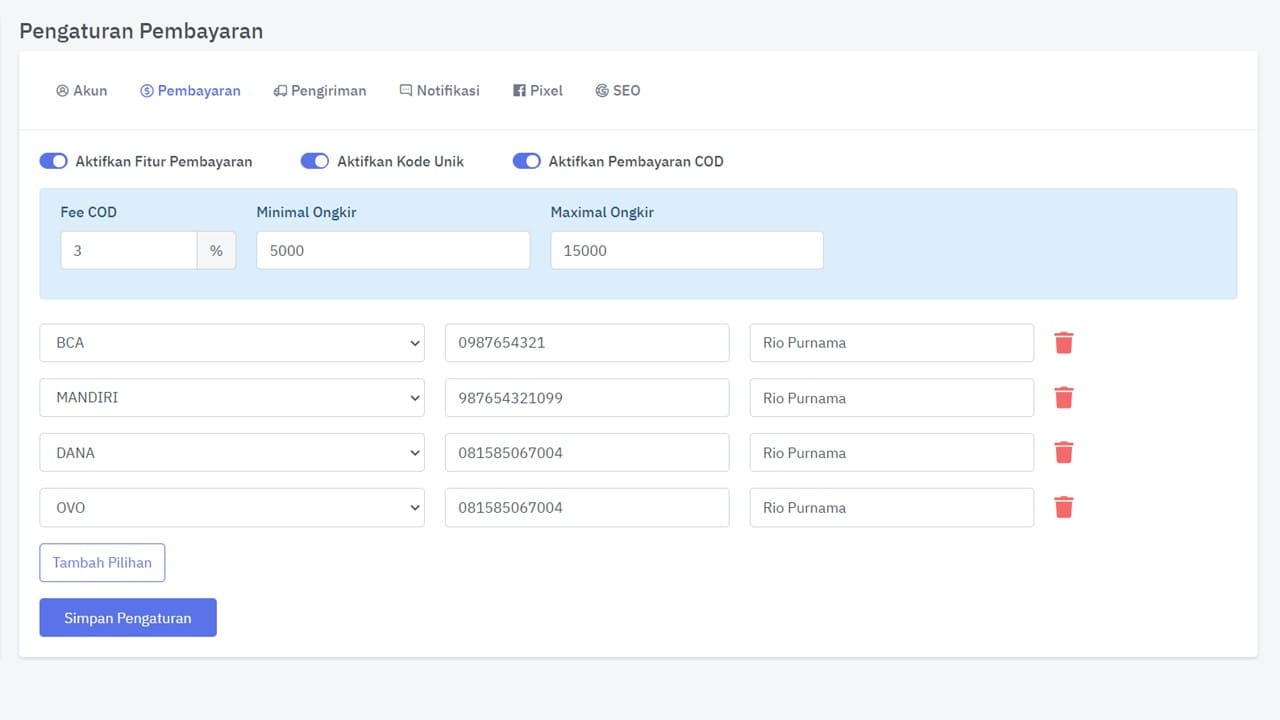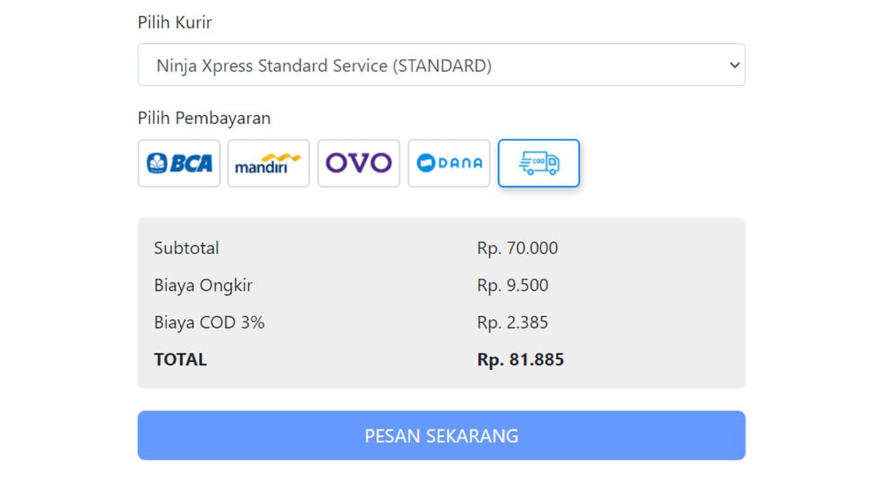 Mudahkan calon pembeli dengan fitur COD, bisa diatur untuk prsentase biaya dari harga produk dan ongkir