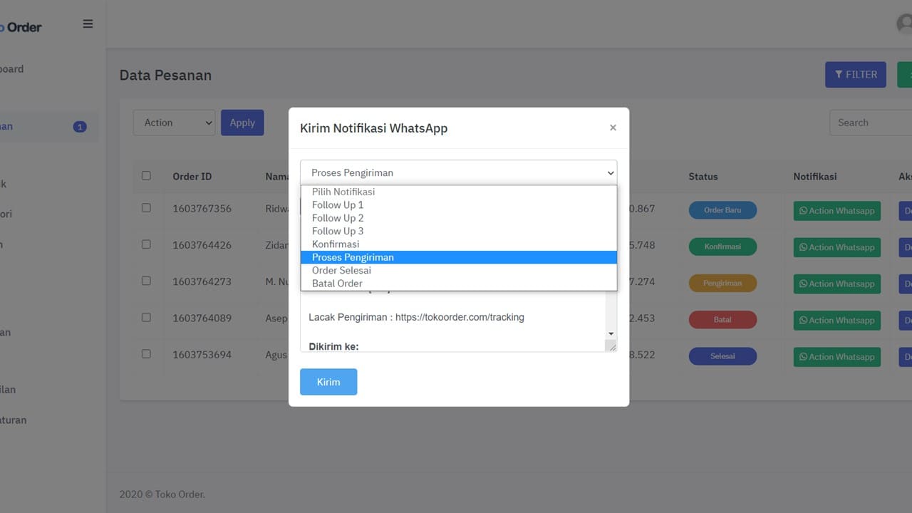 Cukup satu dashboard untuk kirim pesan wa follow up, konfirmasi pesanan, proses pengiriman dan pesanan selesai