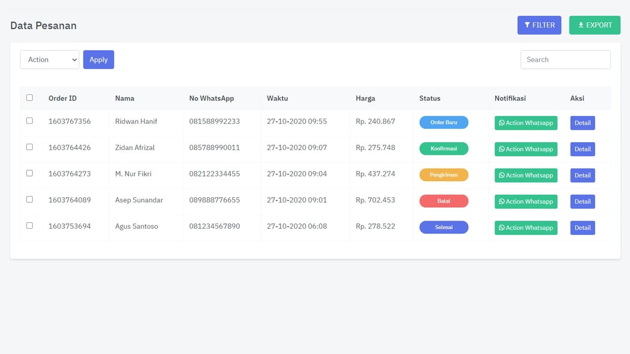 Database orderan yang lengkap memudahkan anda melihat dan esekusi pesanan serta bisa di export ke excel