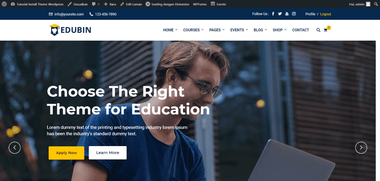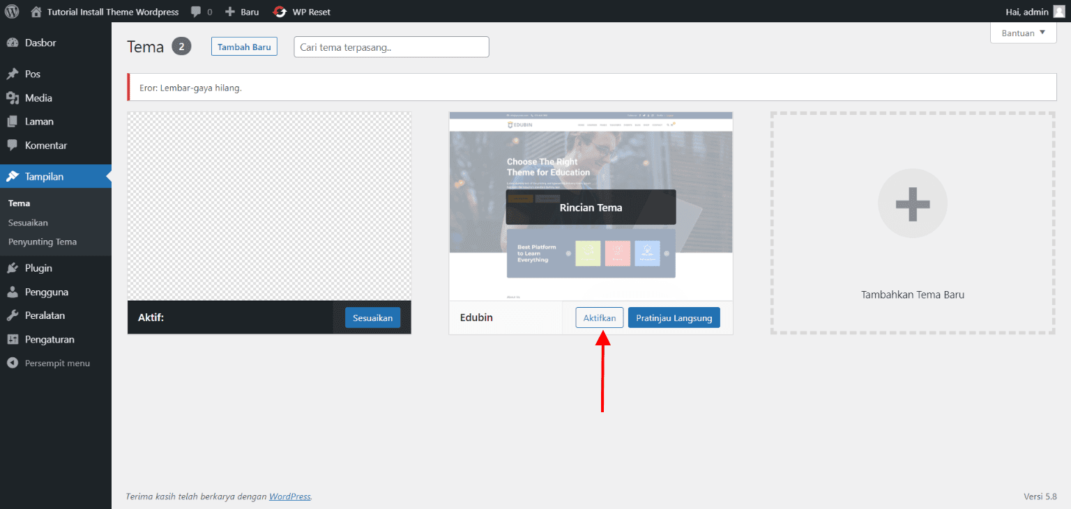 Pada menu “themes” kita dapat melihat theme edubin yang kita install, disini tinggal klik “aktifkan”
