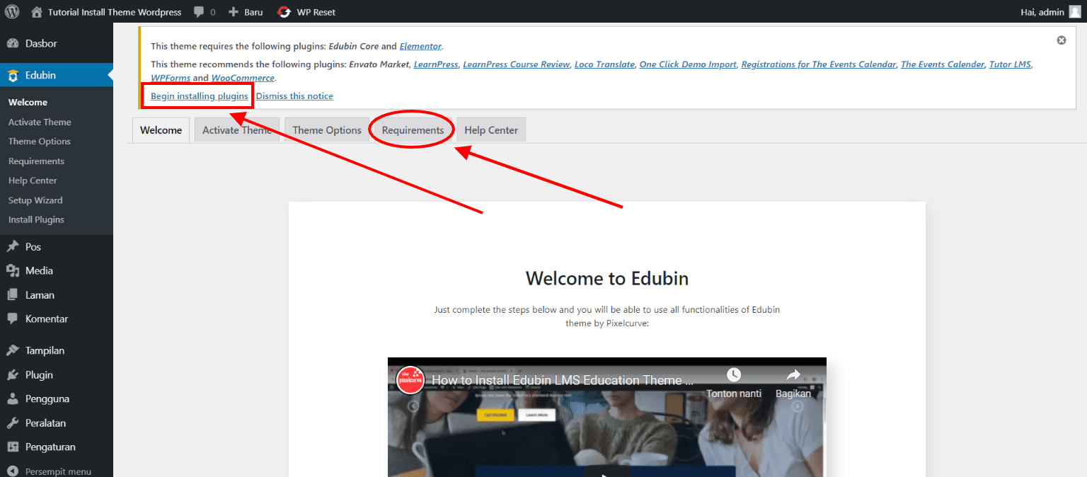 perhatikan gambar 3, klik link yang di kotak merah “begin installing plugins”. disana install saja semua pluginnya, kisaran ada 12 plugin. nanti bisa di nonaktifkan lagi jika memang beberapa plugin tidak akan di gunakan. dan perhatikan gambar 3 yang dilingkar. Disana terdapat System Status untuk theme edubin ini, jika warna merah berarti harus di setting ulang sesuai required dari system themenya sendiri, agar sesuai dengan apa yang di rekomendasikan oleh system theme sendiri.