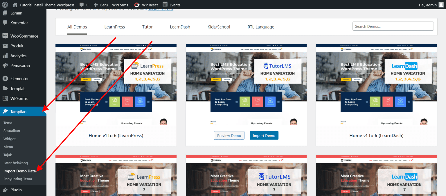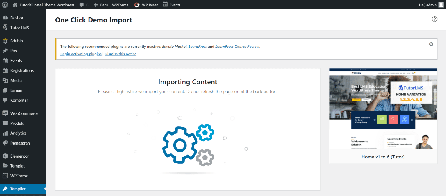 perhatikan gambar 4 diatas, kita bisa pilih demo yang cocok untuk di import tergantung plugin LMS yang akan kita gunakan nanti untuk coursesnya, di tutorial ini kita akan import home V1 to 6 (tutor). langsung klik “import demo” untuk memulai proses importnya.