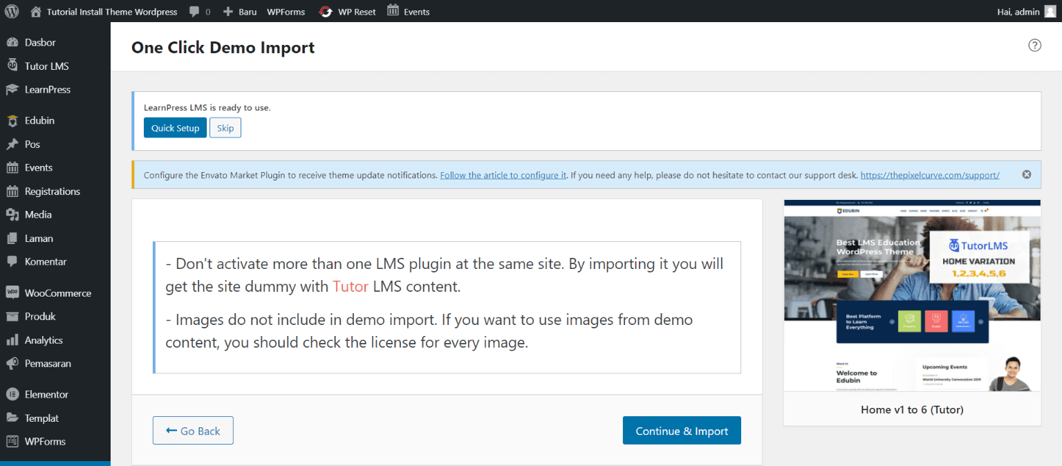 Jika saat memulai import kita melihat notifikasi seperti gambar 5, berarti kita hanya bisa gunakan 1 jenis plugin LMSnya jadi kita bisa disable / me-nonatifkan plugin “learnpress” yang sudah aktif td saat kita install plugin requirednya. dan pastikan lagi plugin Tutor LMS aktif. setelah itu pada gambar 5 lagi, kita refresh dan klik “continue & import”.
